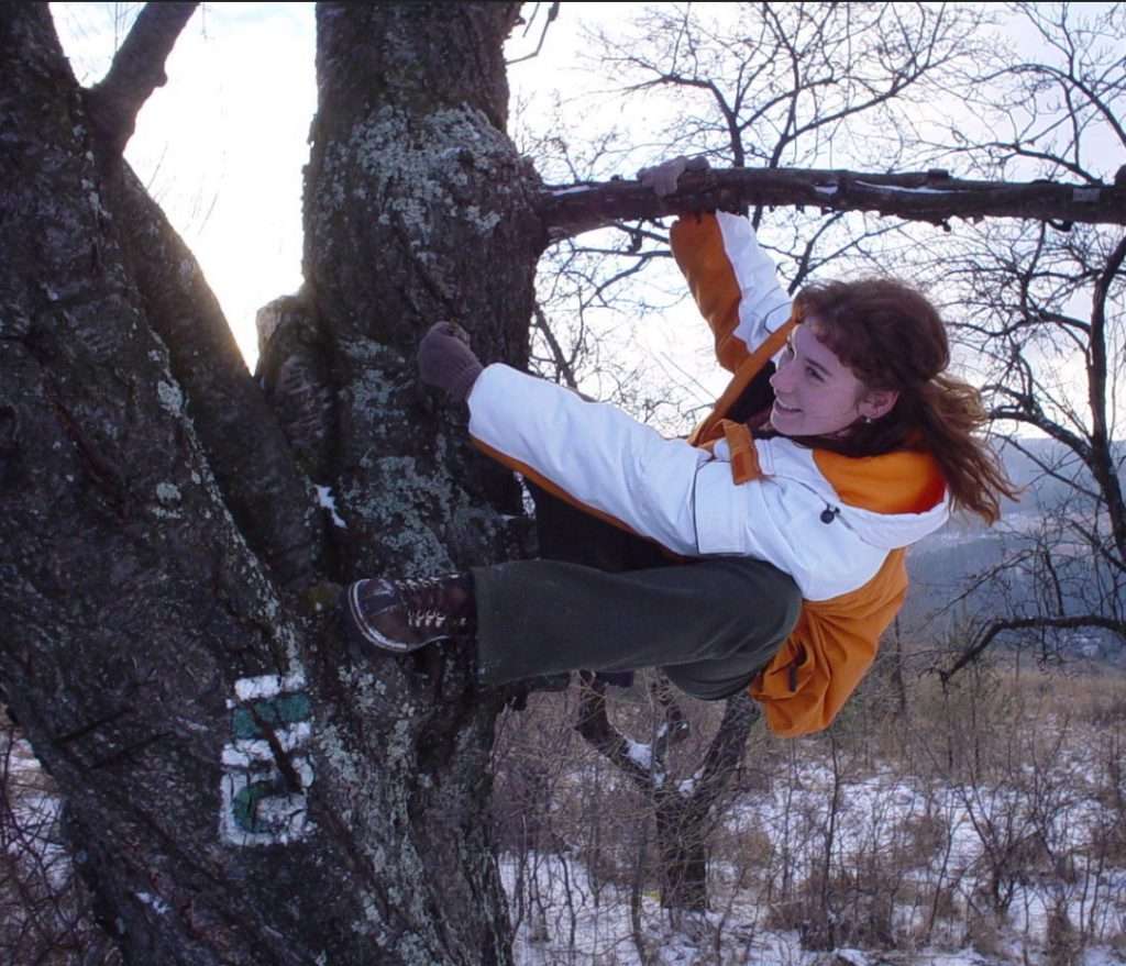 kričí na ňu: Saška, zlez!